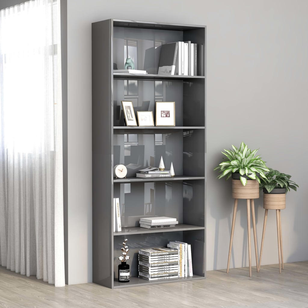 Knjižna omara 5-nadstropna visok sijaj siva 80x30x189 cm