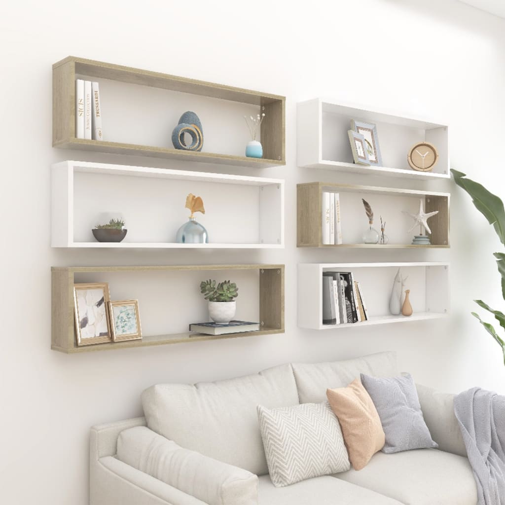 Stenske police kockaste 6 kos. bele in sonoma hrast 100x15x30cm